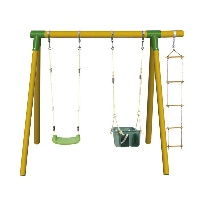 Se combiniamo l'alta qualità con il divertimento troveremo sicuramente questa Altalena doppia Kadi Delixe con sedile Bebè. Questa meravigliosa e resistente altalena è stata realizzata per l'occasione con legni di pino selezionati. I legni sono stati trattati per resistere alle intemperie, come la pioggia, l'aria o il vento. Il legno è stato tagliato in modo arrotondato, il che lo rende molto più resistente e ne impedisce la rottura. Questa doppia altalena è dotata di sedili diversi in modo che possano godere dal più piccolo con il seggiolino con cinghie di sicurezza per la tranquillità dei bambini e dei loro genitori. Oppure il sedile individuale in plastica di alta qualità e resistente con corda sintetica in grado di sostenere un grande peso. Ma non è tutto. Ad un'estremità della struttura c'è una scala favolosa per i più avventurosi da salire. Una grande altalena consigliata per bebè e bambini dai 3 ai 9 anni. Le sue misure sono circa 1,92 m di altezza, 2,50 m di larghezza e 1,66 m di profondità.